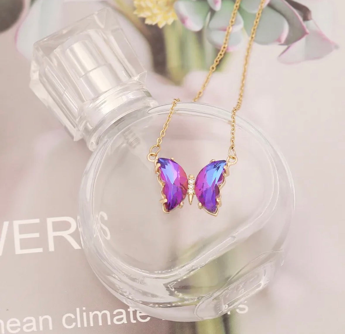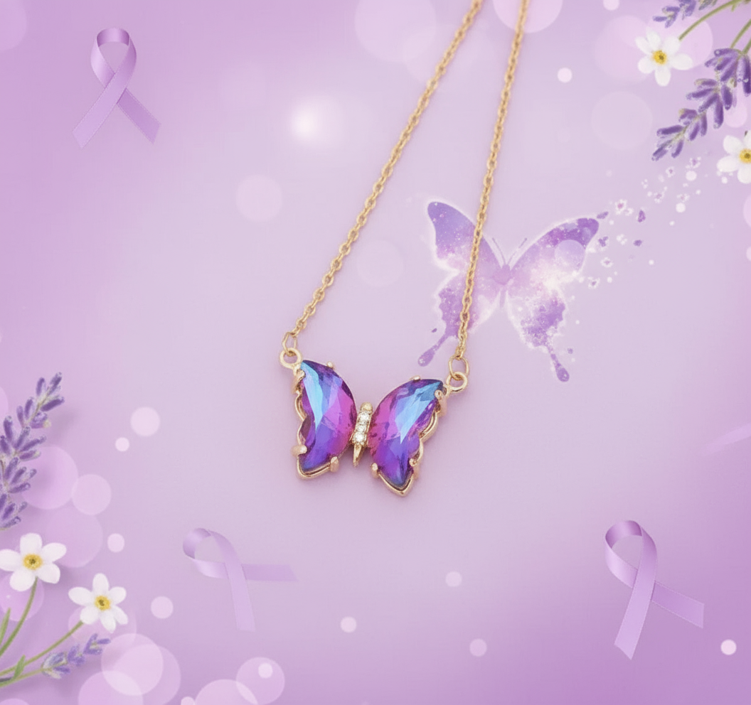 Este delicado collar con dije de mariposa en tonos púrpura y azul iridiscente simboliza transformación, resiliencia y esperanza. Seleccionado como parte de nuestra colección Eco Púrpura, su propósito es dar visibilidad y apoyo a quienes viven con lupus, recordando la fuerza interior y la belleza que florece en medio de los retos. Con cadena dorada fina y un diseño ligero y elegante, es la pieza perfecta para llevar un mensaje de conciencia y solidaridad mientras complementa tu estilo.