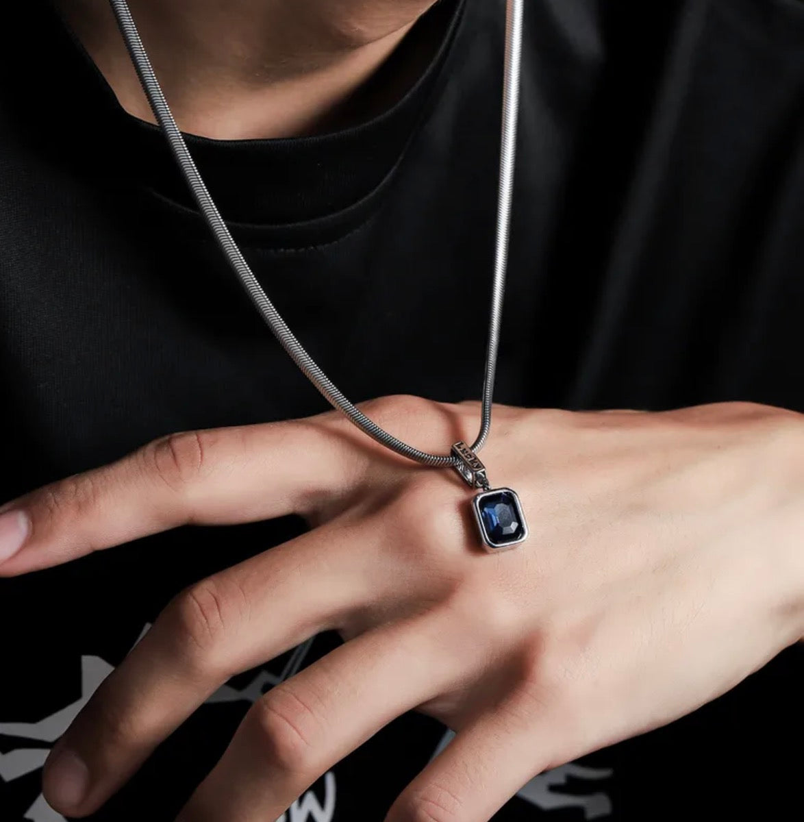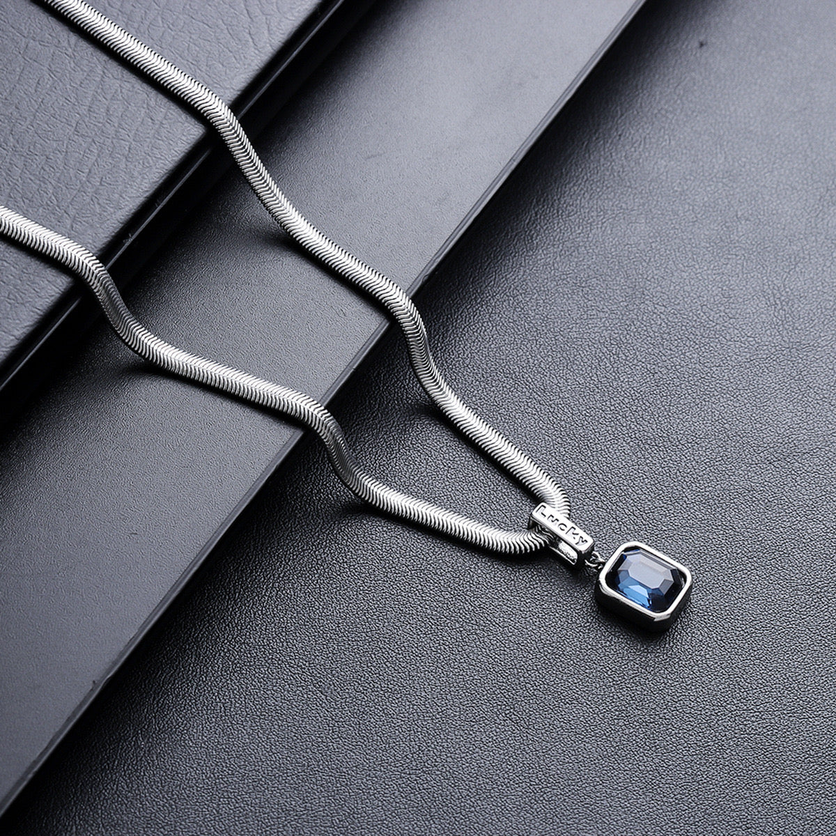 Collar hecho en acero de titanio con patron de serpiente con pendiente zafiro, parte metalica del pendiente hecha en aleacion.