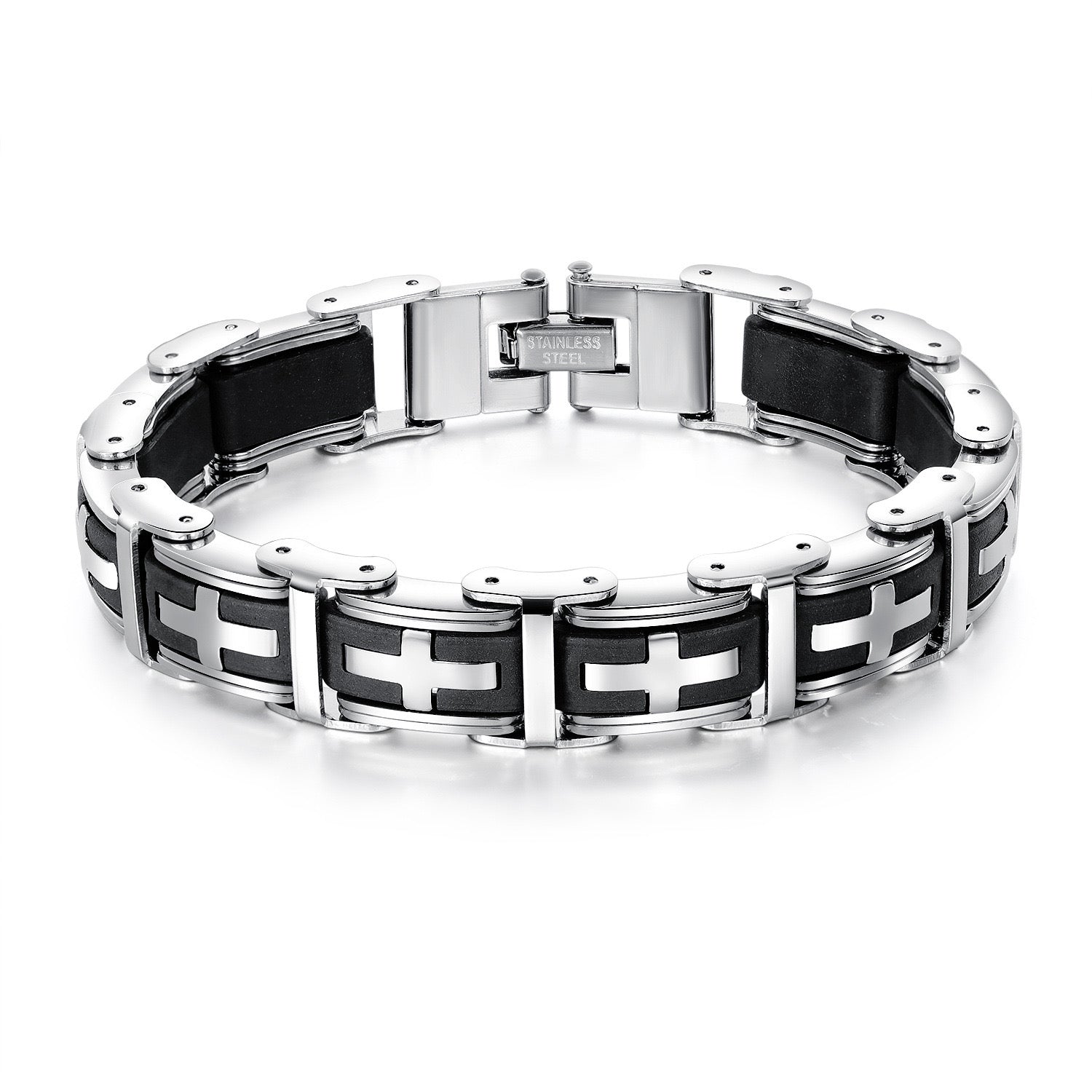 Pulsera cruz 14mm x 22cm, hecha en acero inoxidable y silica gel.